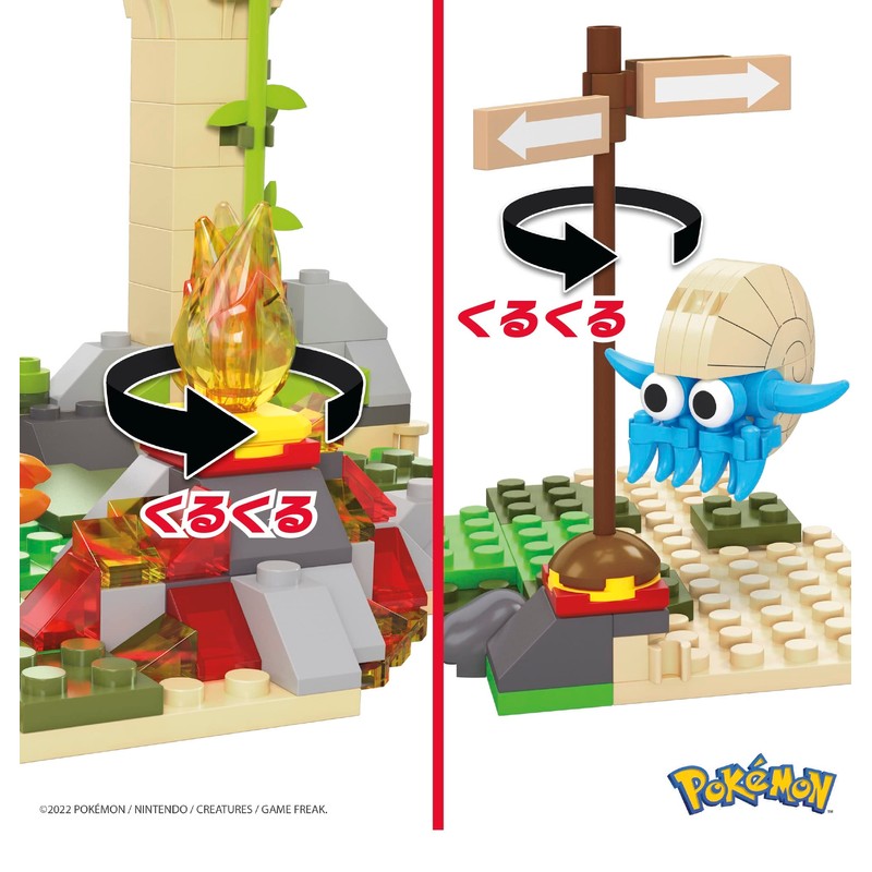 - Contents: A set of blocks that recreate ancient ruins hidden by Pokemon. Let the Tortoise Lights and explore them. Beware the way sign spins. A fun action that opens the brush when you press the blocks. 464 pieces totaling including 3 Charmander, Karakara and Omnite figures Combine and play with other Adventure World series to expand the world of Pokemon. Adventure stories are endless when you build your own Pokemon world. Encourages the joy of creativity and problem solving skills as you assemble them as you want