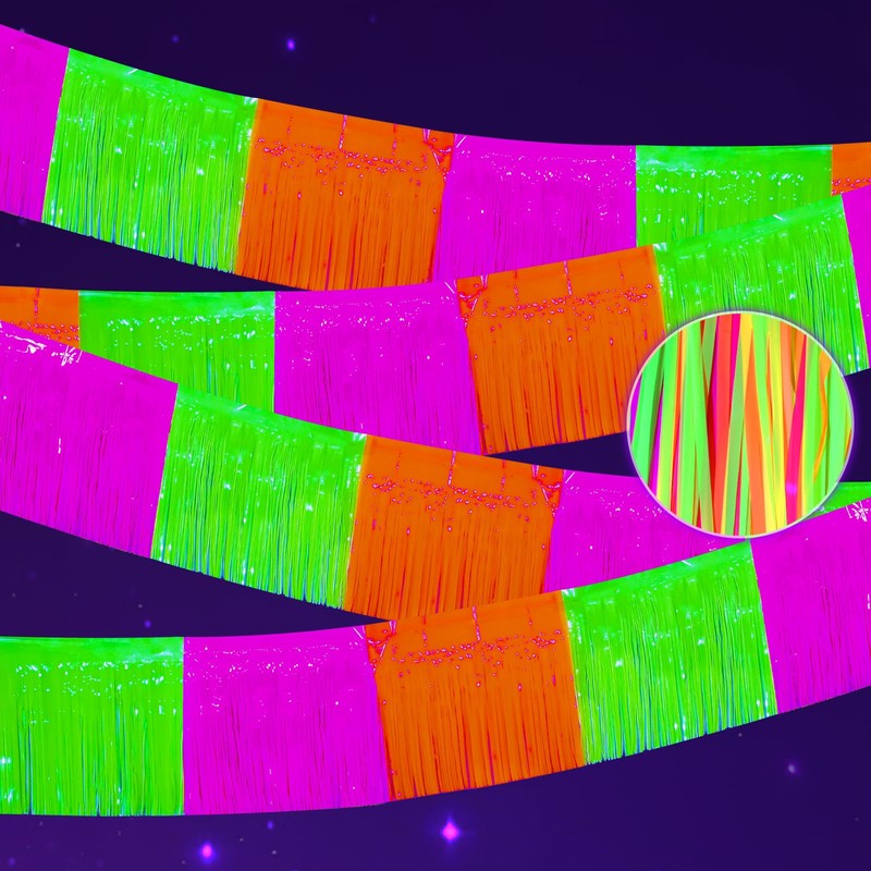 - 【 WIDELY APPLICATIONS】: These Glow In The Dark Neon foil fringe Garland are perfect for neon birthday party, live streamer backdrop, dessert table backdrop, stage backdrop, disco backdrop, bar backdrop, office backdrop decoration, home decoration, pride party decorations, classroom decorations, etc.