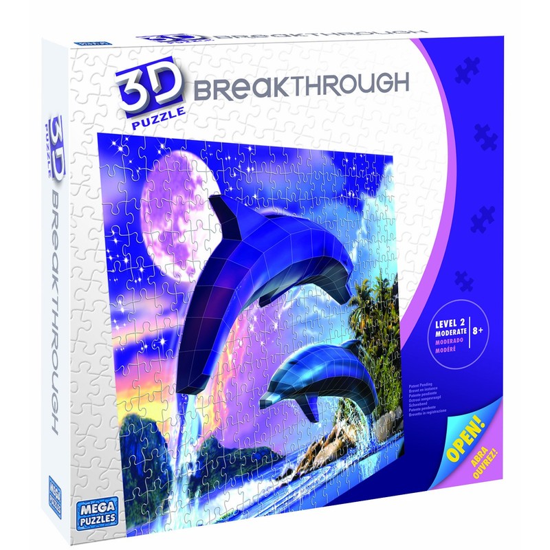 3D Breakthrough Puzzles are a unique patent-pending puzzle system that uses real 3D innovation to create stunning works of art. 3D Breakthrough puzzles unite the traditional flat-art jigsaw puzzle with 3D technology. Puzzlers first put together and glue the jigsaw puzzle, and then use specially-designed clips to construct the unique cardboard pieces into 3D components, creating images that fit seamlessly into the overal puzzle artwork. Level 2 features a flat jigsaw puzzle of 150-300 piece and a 3D build that consists of a large amount of simple folding techniques. "Marine Life" (Dolphin)-Depicts 3D dolphins in a graceful leap under the moonlit sky. Ages 8+ Level 2: Moderate