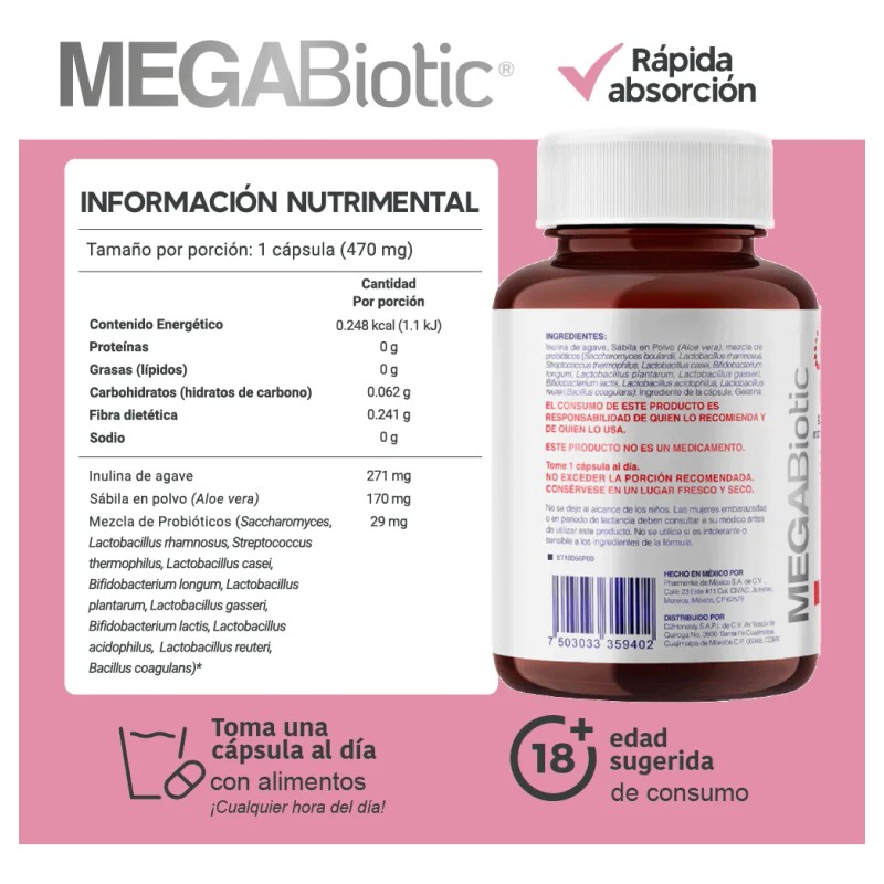 Los Probióticos MEGABIOTIC, con una potente fórmula de 20 Billones de probióticos y 11 cepas distintas, ofrecen un suplemento avanzado para el cuidado integral del sistema digestivo. Este producto, diseñado tanto para mujeres como para hombres, incluye prebióticos, Inulina de Agave, Lactobacilos y Aloe Vera (Sábila), en una presentación de 60 cápsulas que cubren un tratamiento de 60 días. Con solo una cápsula diaria junto con los alimentos, MEGABIOTIC facilita una mejora significativa en la salud digestiva y el bienestar general.