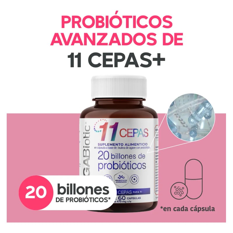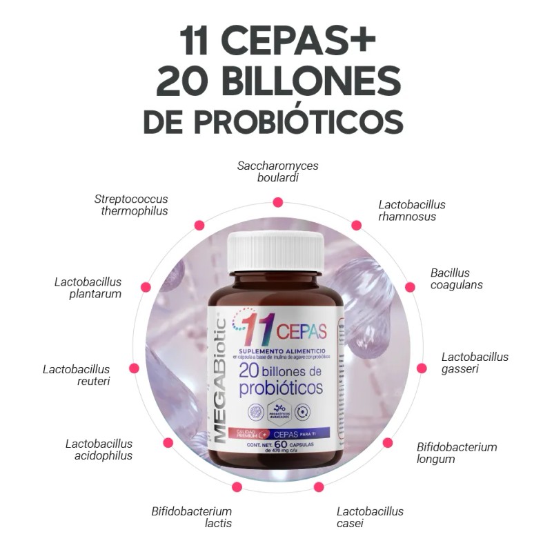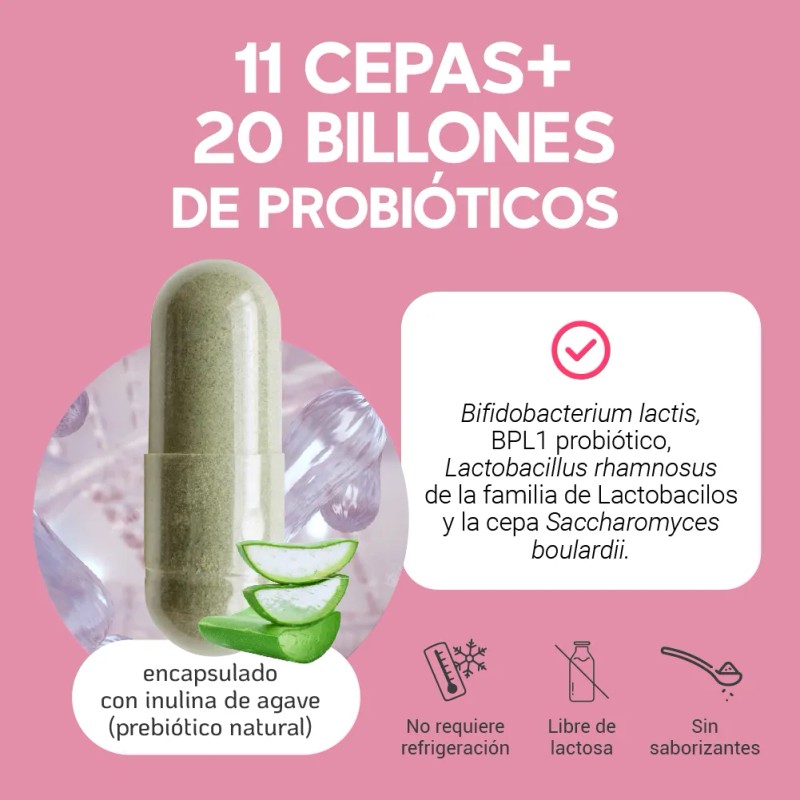 • Ingredientes Clave: 20 Billones de Probióticos, 11 Cepas, Prebióticos (Inulina de Agave, Aloe Vera)