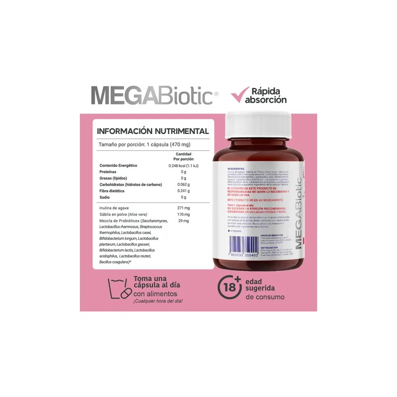 Los Probióticos MEGABIOTIC, con una potente fórmula de 20 Billones de probióticos y 11 cepas distintas, ofrecen un suplemento avanzado para el cuidado integral del sistema digestivo. Este producto, diseñado tanto para mujeres como para hombres, incluye prebióticos, Inulina de Agave, Lactobacilos y Aloe Vera (Sábila), en una presentación de 60 cápsulas que cubren un tratamiento de 60 días. Con solo una cápsula diaria junto con los alimentos, MEGABIOTIC facilita una mejora significativa en la salud digestiva y el bienestar general.