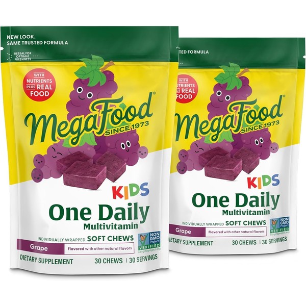 MegaFood Kids One Daily Multivitamin Soft Chews – Vitamins C, D, B, E for Immune Support & Growth – Vegetarian, Non-GMO, Allergen-Free – Grape Flavor – 30 Chews (2-Pack), Age 4+