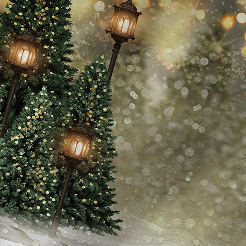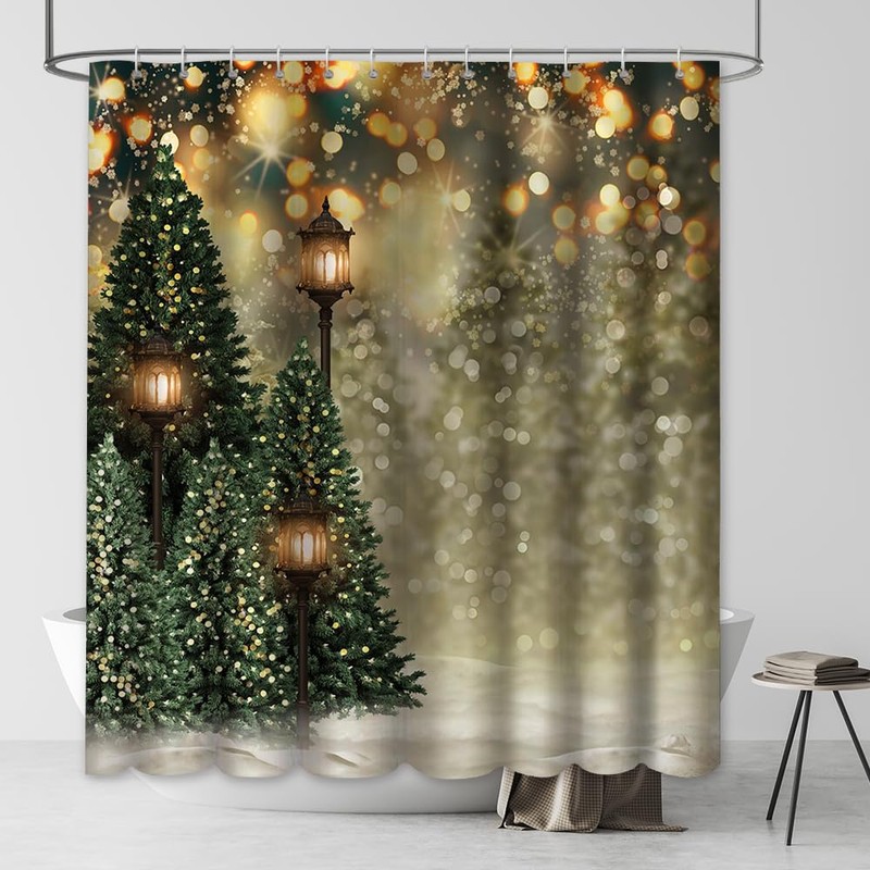 MEHOFOND 72x72 Inchs Christmas Winter Shower Curtain for Bathroom Decoration Snowflake Bokeh Pine Trees with Outdoor Nature Landscape White Snow Green Tree Street Lamp Bath Tub Accessory
