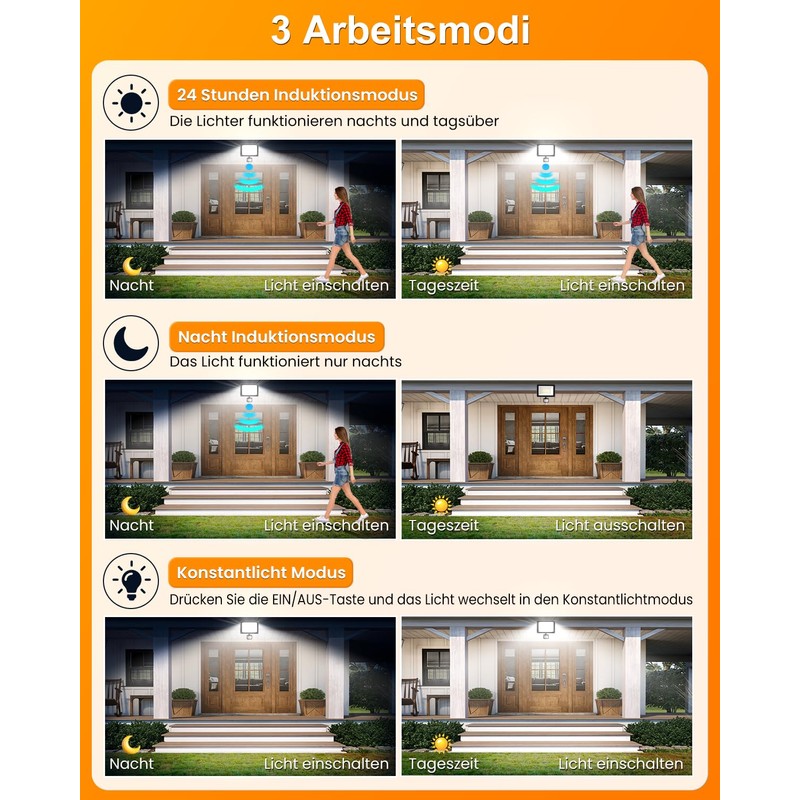 - ??LED Strahler mit Fernbedienung??Der LED Strahler mit Bewegungsmelder wird mit einer Fernbedienung geliefert, so dass Sie den Au?enstrahler mit der einfachen und leicht verst?ndlichen Fernbedienung einfacher und sicherer bedienen k?nnen, und Sie k?nnen auch die Tasten an der Leuchte verwenden anpassen. Always-On-Modus/24-Stunden-Erkennungsmodus/Nacht-Erkennungsmodus; 10 Helligkeitsstufen einstellbar; Erfassungsabstand ist einstellbar; Induktionsbeleuchtungszeit ist einstellbar; Timing-Funktion