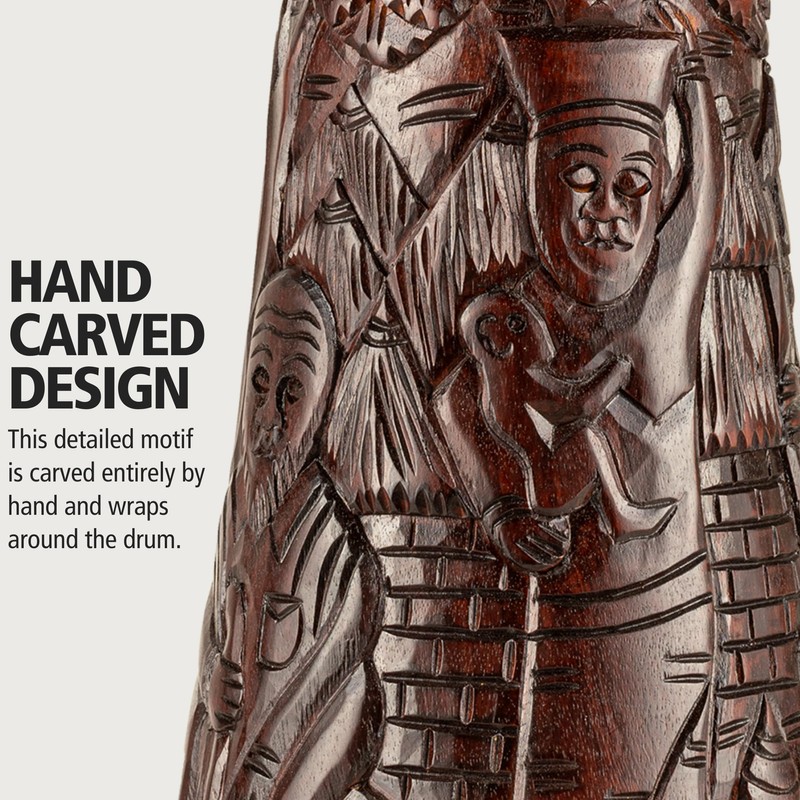 - ZOOM IN: the exterior "Village" motif is carved entirely by hand and wraps around the shell; there will be slight variations in the handmade artwork, making each djembe one-of-a-kind