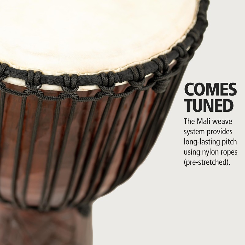 - OF NOTE: the djembe comes tuned and ready to play right out of the box; the West African Mali Weave rope tuning system holds a long-lasting pitch, and we pre-stretch the ropes so it sounds great right away (comes with tuning instructions)