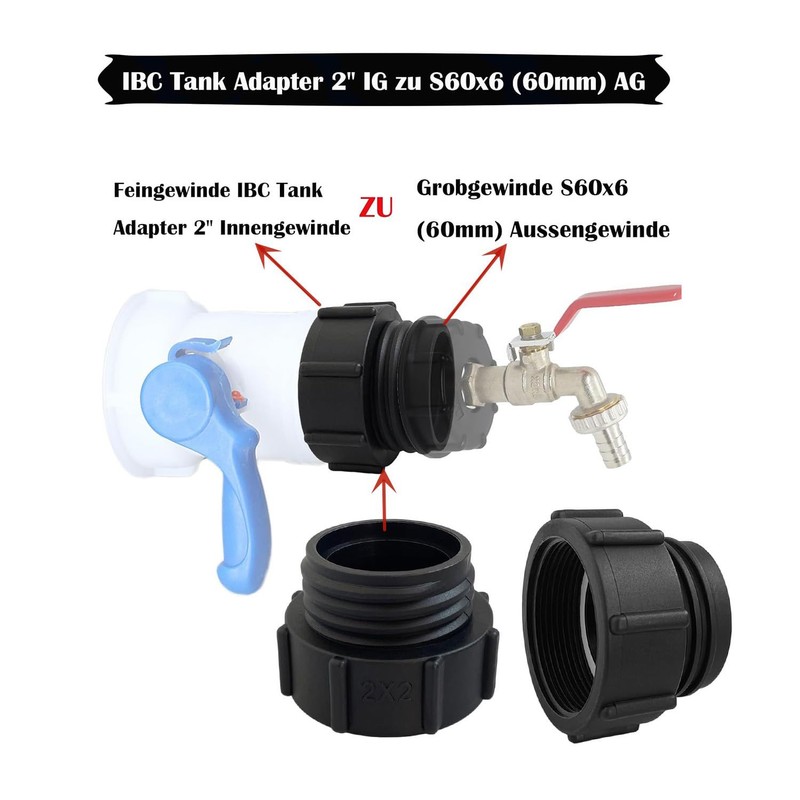 - Scope: the connection thread is 2 inch fine thread internal thread to S60 x 6 (60 mm) external thread coarse thread. Works with all brands of IBC tank, for IBC valves with a nominal width of 2 inches and S60x6.