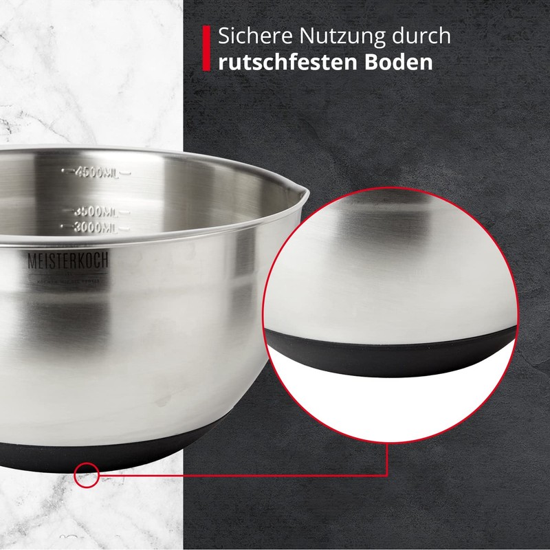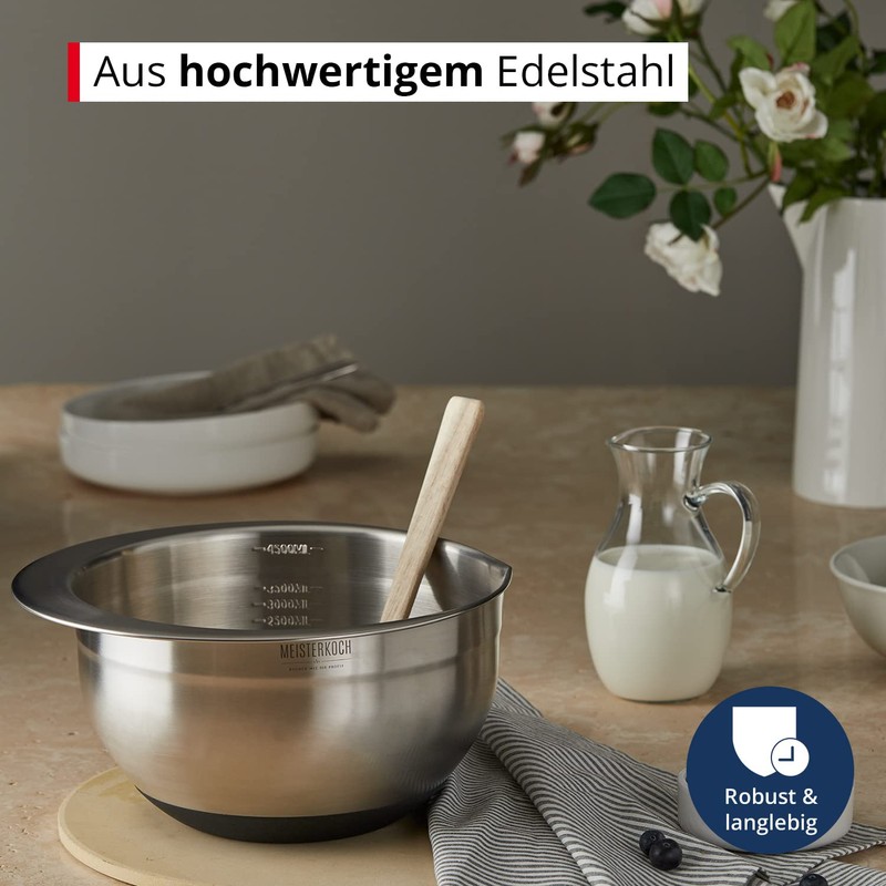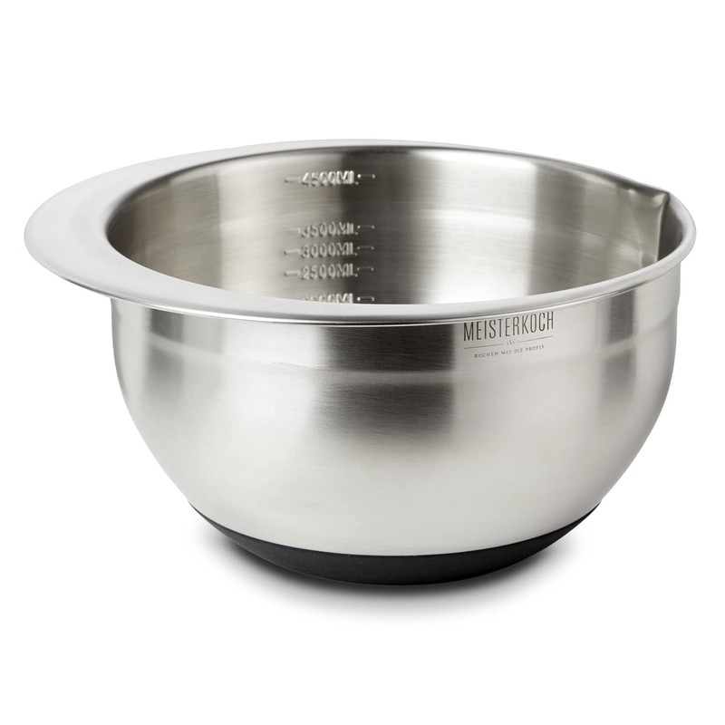MEISTERKOCH Bowl 4.5 Litres Stainless Steel in Silver-Coloured with Inner Scale and Spout, Non-Slip Base, Mixing Bowl, Salad Bowl, Bowl, Bowl, Ideal for Mixing, Stackable