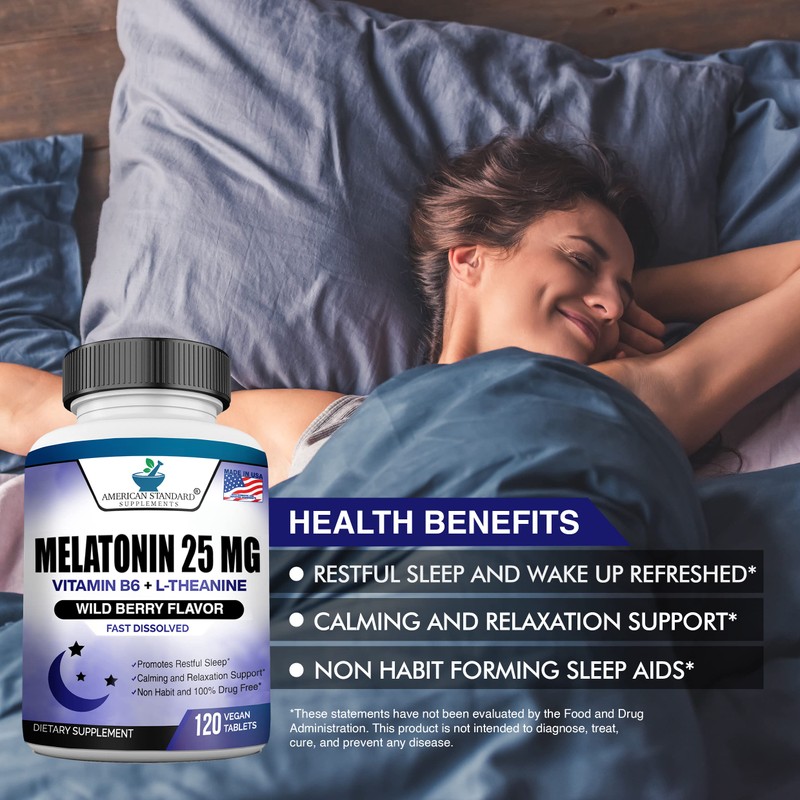 Melatonin 25mg Per One Tablet, 120 Chewable Tablet with L-Theanine & Vitamin B-6, Supports Healthy Sleep Cycle , Promotes Calming & Restful Sleep, Vegan, NON GMO, Made In USA