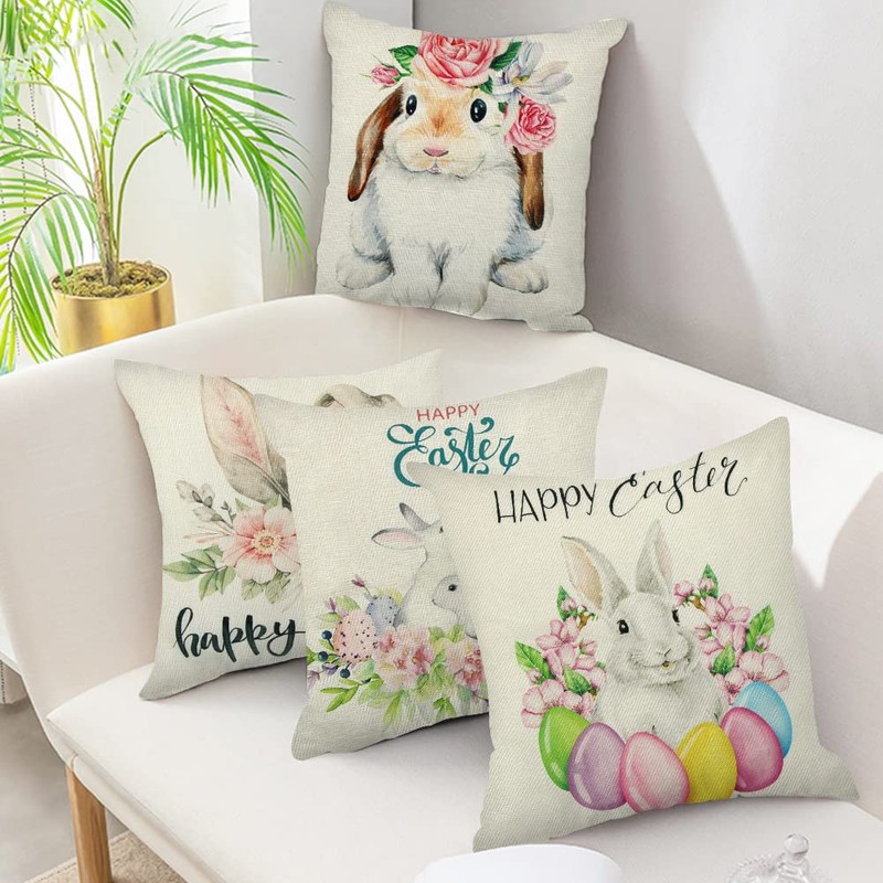 Meleager 4 x Easter Cushion Covers, Easter Decoration, Bunny Cushion Covers, Easter Eggs, Linen Decorative Cushion Covers, Home, Cushion Covers, 45 x 45 cm, for Sofa Bedroom