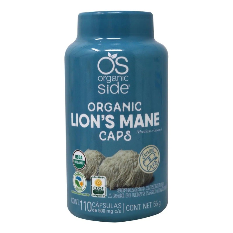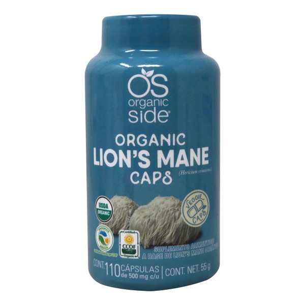 Suplemento natural de Hongo Melena de León (Lion’s Mane) de Organic Side en cápsulas veganas. Diseñado para apoyar la memoria, concentración y salud cognitiva de manera segura y efectiva..