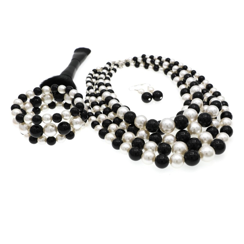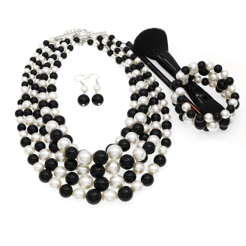 MeliMe Faux Big Pearl Srand Necklaces for Women 5 Layers Pearl Bib Collar Necklace Bracelet and Earrings set 1920s Costume Pearl Jewelry Bridal Wedding gift (black white)