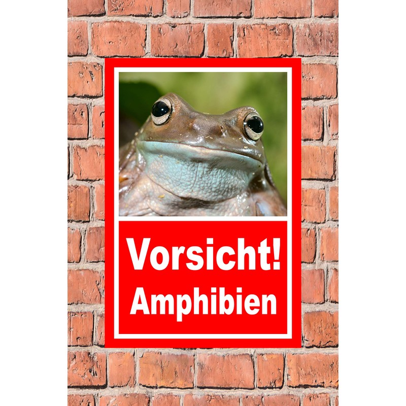 • Sign text: Vorsicht Amphibians -- Hint auf Frog, Frog, Toads, Lurch, Lurche, Salamander, Newt, Unke, Tree Frog, Water Frog, Springfrog, Grass Frog, Brown Frog