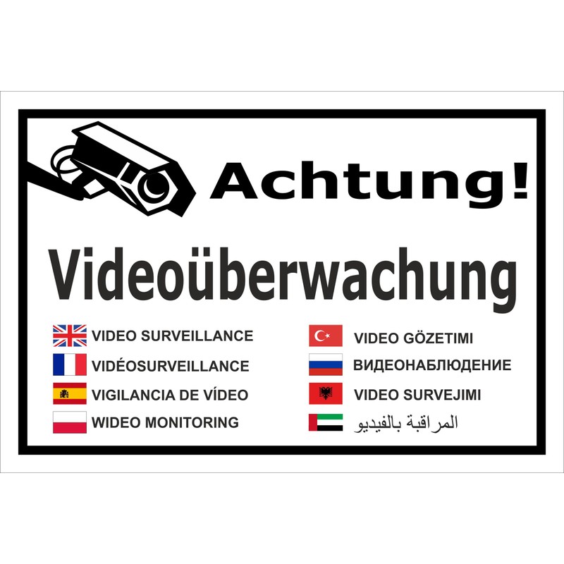 - Text of the sign: Achtung Videoüberwachung - in 9 languages