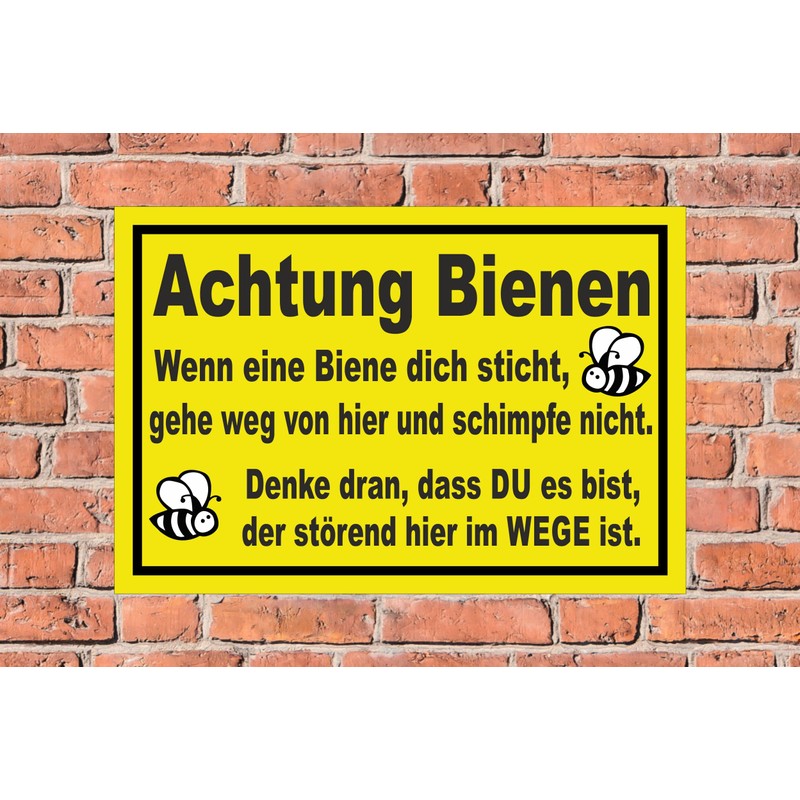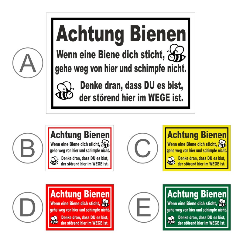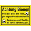 - Text of the sign: Achtung Bienen - Wenn Dich eine Biene sticht, gehe weg von hier und schimpfe nicht - Denke daran, dass Du es bist, der störend hier im Weg ist.