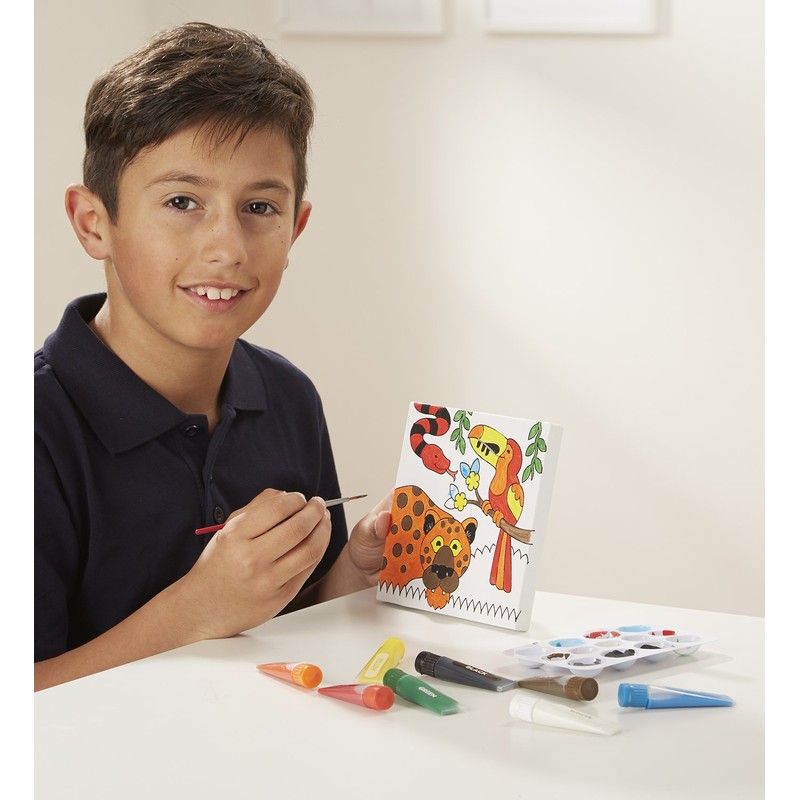 - Includes 3 stretched canvases, 8 tubes of paint, 3 paintbrushes, mixing tray, and display easel