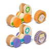 - Roll, stack, and grasp the double-sided wooden GO Tots disk and make it spin in the wooden car
