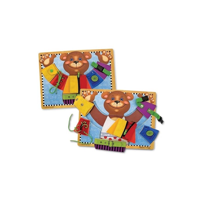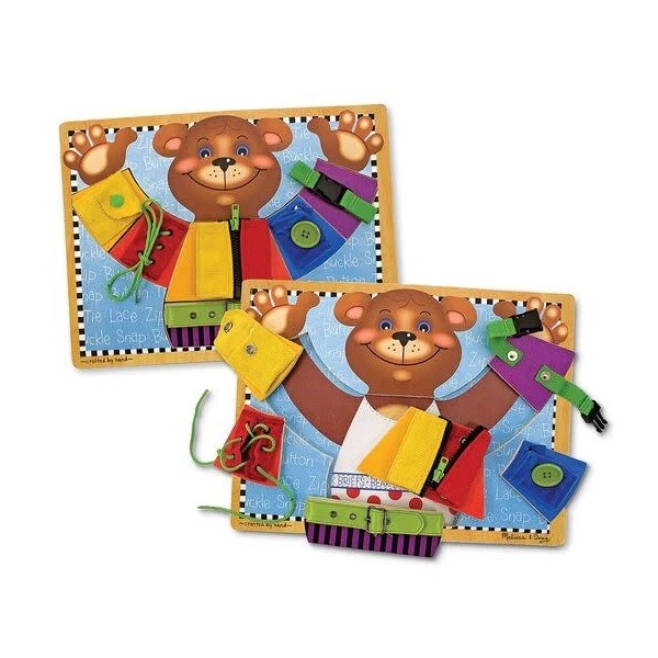 This wooden bear is always smiling, but he's happiest when fully dressed! Getting dressed won't be such a puzzle once zipping, buckling, snapping, lacing and tying, and other dressing skills are mastered. Each skill is contained on a separate, removable wooden puzzle piece for easy practice. Develop fine motor and life skills with this great activity.