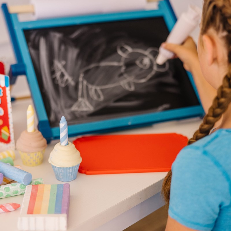 - 33-piece set includes jumbo chalk sticks in a rainbow of colors, chalk shaped like cupcakes, candles, cake, cookies, donut, and frosting; activity menu with drawing and game ideas
