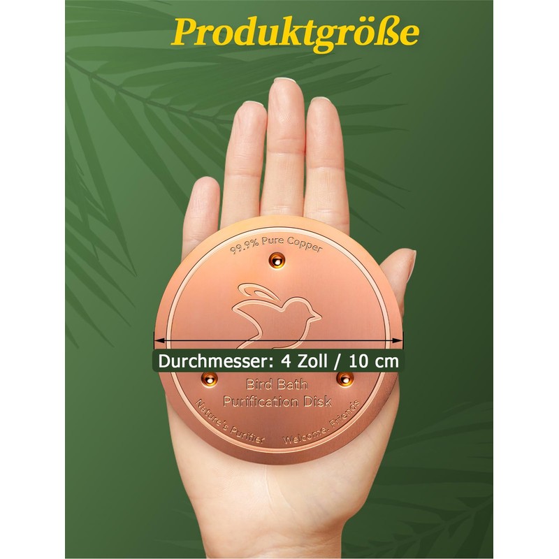 - EFFECTIVE DESIGN FOR MAXIMUM CONTACT The birdbath copper disc features a three-point support design, which maximizes surface contact with the water and keeps your bird bath clean and fresh. Say goodbye to frequent and tedious cleaning of slimy green bird baths. With the copper disc, the cleaning intervals can extend from about every 3 days to about every 20 days, saving you about 120 minutes of cleaning time every month.
