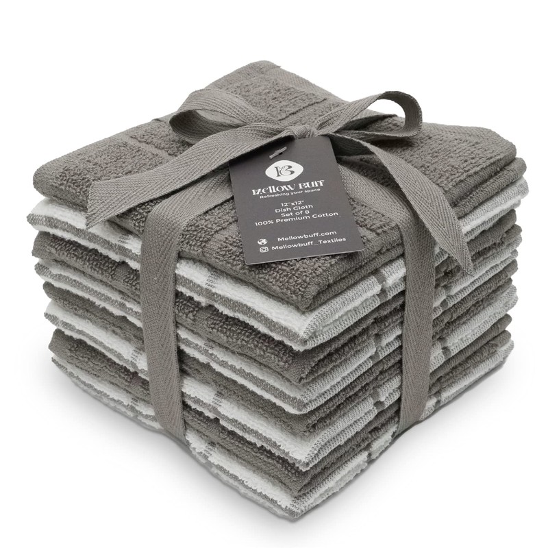 Mellow Buff Paño de rizo 100% algodón, paquete de 8 unidades de 12 x 12 pulgadas, súper suave y absorbente, perfecto para limpieza de cocina y lavado de platos, gris claro