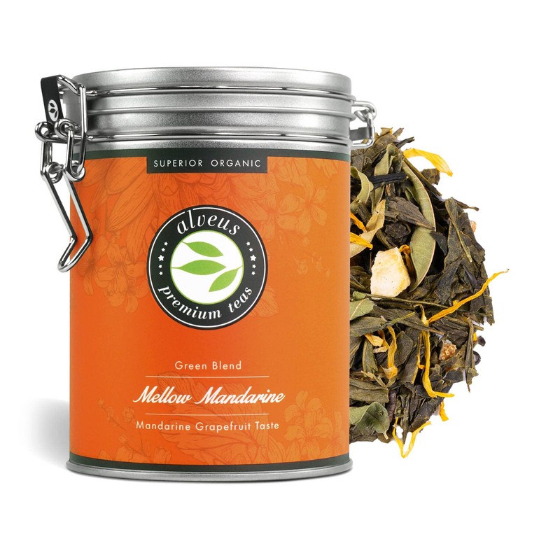 "Mellow Mandarine" Grüner Tee Lose BIO mit Mandarine Grapefruit Geschmack, 100 Gramm Aromatisierter Grüntee in Dose (ca. 40 Tasse) von alveus