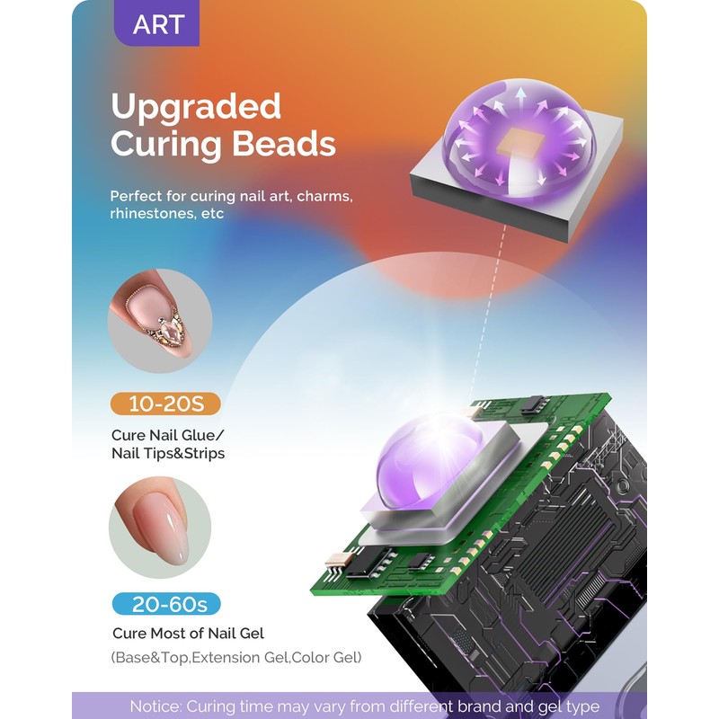 - - FROM MELODYSUSIE HANDHELD UV LIGHT COLLECTION: Upgraded from ART01R flash cure light, ART01R with stand provides you flawless curing gel x nails experience with its intimate hands-free design. Equipped with cutting-edge 2025 innovative chips, it delivers five times the concentrated light, it's especially suitable for fast-curing rhinestone glue, 3D gel nail designs, and decorations in just 10 to 20 seconds.