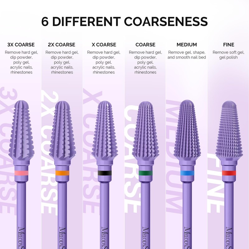 MelodySusie Tornado Nail Drill Bits For Electric Nail Drill Machine The Purple Tornado carbide bits are coated with a purple coating to prevent the carbide from damaging quickly, therefore making it longer lasting. This carbide drill bit only fits 3/32" shanks. The drill bits also come in 6 different grit sizes (ranging from triple coarse to fine). The bit is great for general surface work such as cleaning, prepping, and removing gel polish. The rounded tip helps prevent any damage to the cuticles and sidewalls of the nail bed. The difference from the 5-in-1 drill bits, the tornado is only a one-way rotating drill bit.