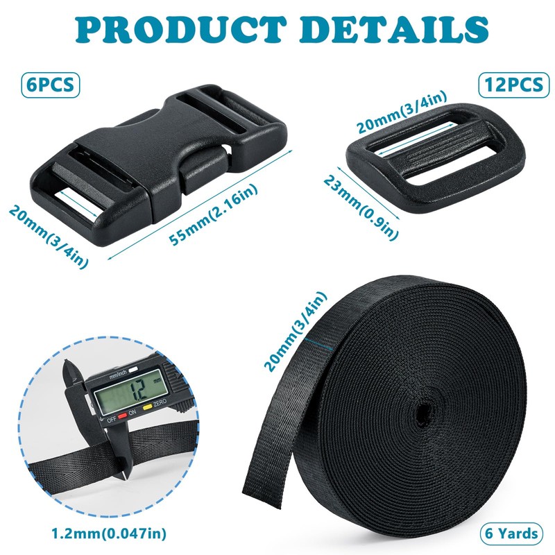 - [ Package Included ] - 6 yards 3/4 inch (20mm) Webbing Straps + 6 pcs Dual-side Release Buckles + 12 pcs tri-glides sliders.