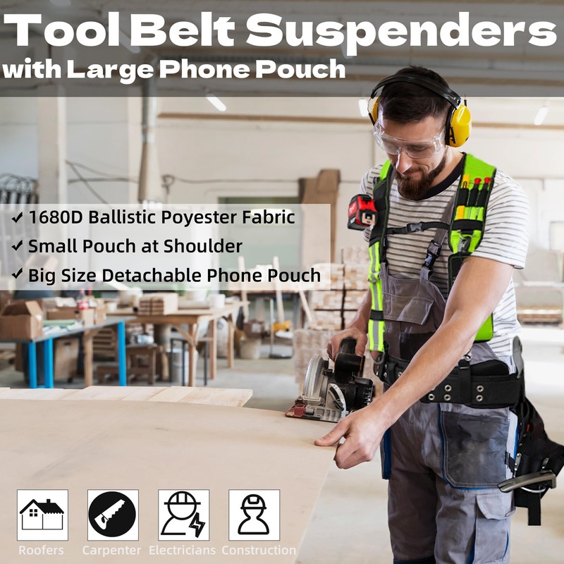 - Work Padded Suspender---The padding is just enough to keep the straps from cutting into your shoulders.3 point Support Design for your Tool belt,Large Detachable Phone Holder work a phone in a large case with high visibility Tape , utility pockets ,Pencil holder , tape measure clip,webbing holder make your job more easy