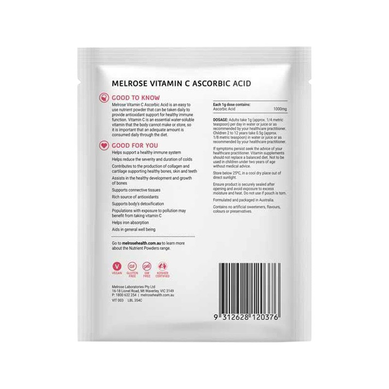 Melrose Vitamin C Ascorbic Acid is an easy to use nutrient powder that can be taken daily to provide antioxidant support for healthy immune function. Vitamin C is an essential water-soluble vitamin that the body cannot make or store, so it is important that an adequate amount is consumed daily through the diet.