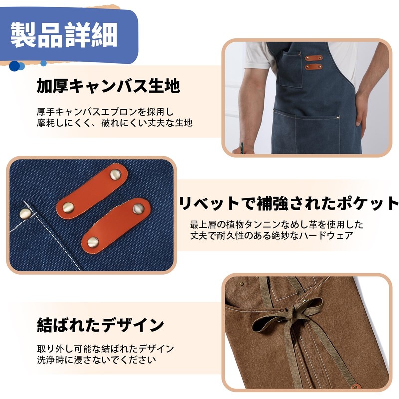 • 【加厚キャンバス生地】:厚手キャンバスエプロンを採用し、摩耗しにくく、破れにくい丈夫な生地。耐久性に優れた丈夫なエプロンで、DIY作業や作業エプロンとして長く使用可能。アウトドアや職人作業にも最適!