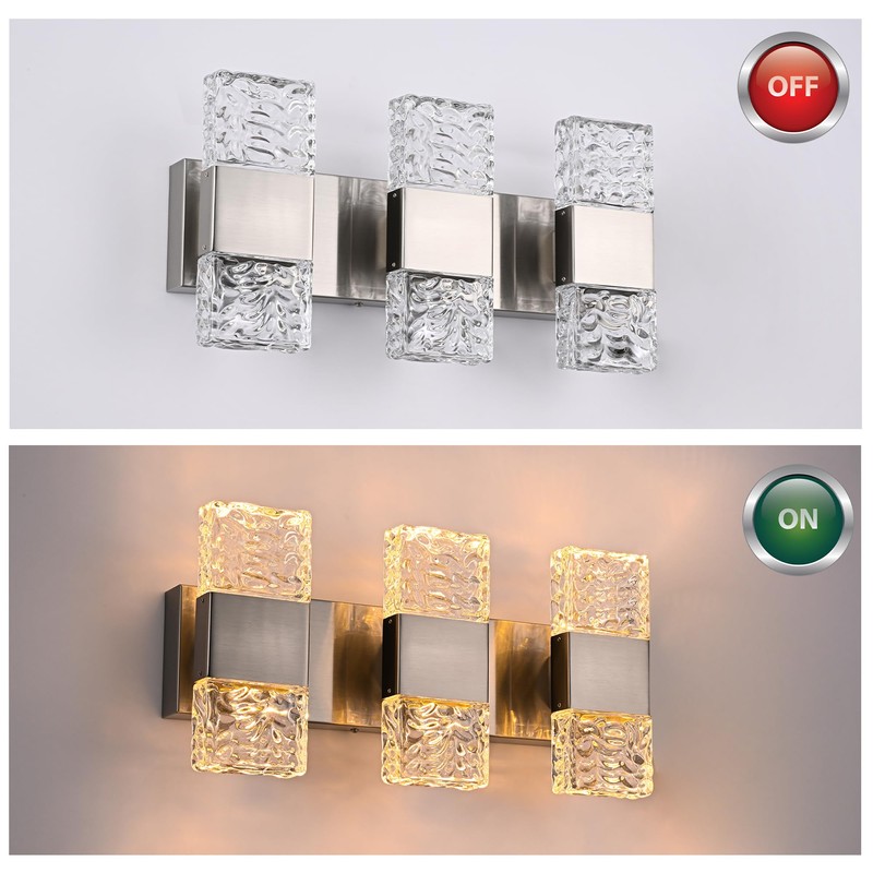 - Elegant Design: Modern bathroom led vanity lights perfect combination of sleek brushed nickel metal metal base and unique pattern crystal column create a modern yet luxurious aesthetic. When lit, it will cast a warm and beautiful lighting glow. Even when turned off, it can showcase a elegant atmosphere for decoration
