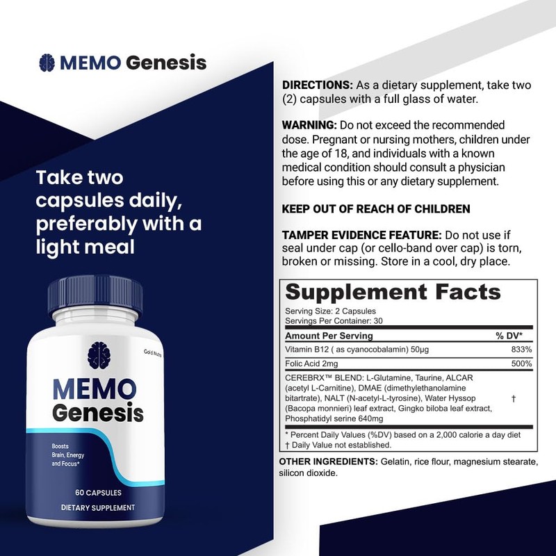 - Wellness that fits your schedule: Two Memo Genesi Capsules a day, taken with a meal, help keep your body moving with ease and confidence.