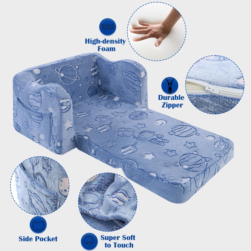 - Glow-in-the-Dark Feature: Features a unique astronaut pattern with a magical glow. Place the toddler sofa in bright light or sunlight for 10-15 minutes, then move it to a dark room to see it shine. The brighter the light exposure, the stronger the glow effect. Makes a great gift for birthdays, Christmas, or baby showers