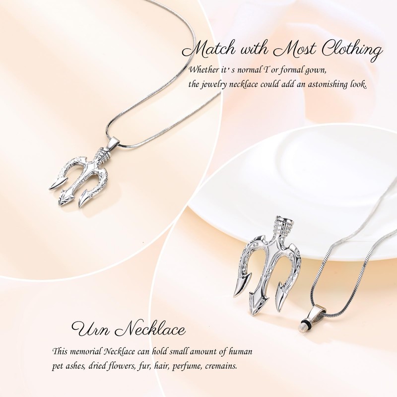 - Wearing: The Poseidon trident pendant necklace is very comfortable to wear. Let you stand out among your friends. It can hold a small amount of ash, dried flowers, essential oils, a lock of hair, soil or sand. It is a great way to remember loved ones, always leave them with you. You can engrave a text on the small steel disc (e.g. B. name, date, blessing, logo)
