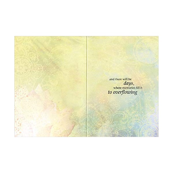The interior of this Tree-Free Greetings Sue Zipkin, Joanne Fink sympathy card design reads: and there will be days, where memories fill it to overflowing. The card measures 5x7 inches and is printed on recycled heavy cardstock. Includes 1 card and 1 envelope. The card has the following special features: recycled paper, full color interior. Card and envelope are made from 100% post consumer recycled paper. Paper made with wind power. Green certified. Made in the USA.