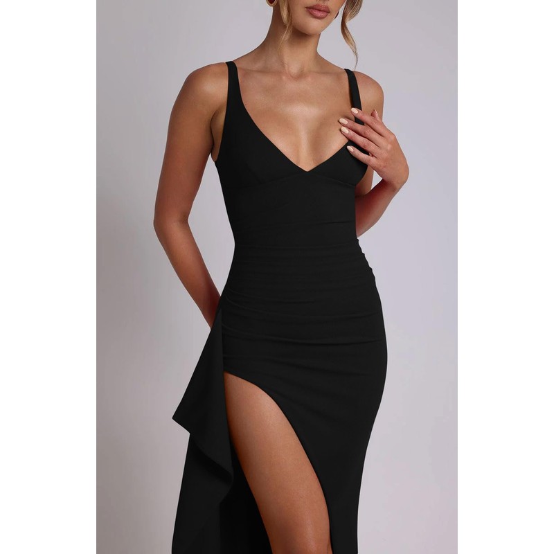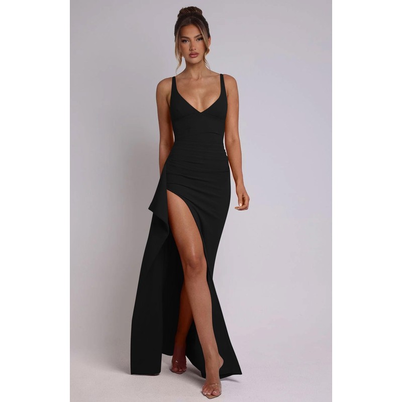 - Feature:This plunging maxi dress design features asymmetric pleats to the body, draped detail thigh high split and adjustable straps to get your perfect fit.