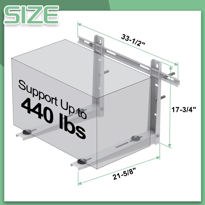 - Universal Dimension: The mini split support bracket measures 21-5/8" Depth x 17-3/4" Height.Maximum load capacity up to 440 lbs.Universal fits for 9,000 - 36,000 BTU air conditioners on the market.Please measure the dimension of your equipment before purchasing.
