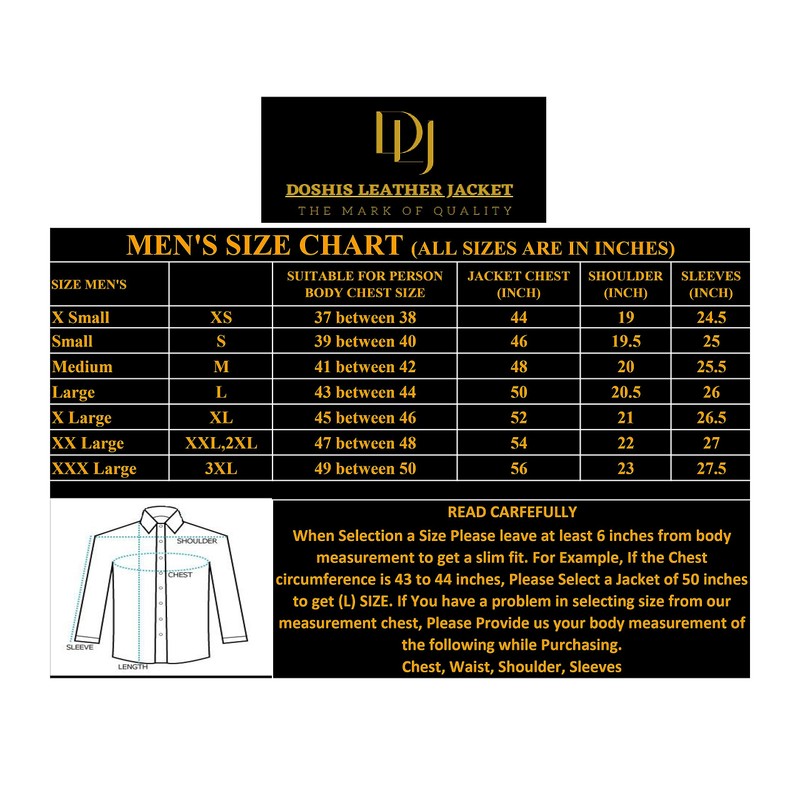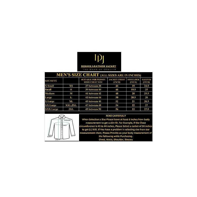 - Perfect Fit: This leather jacket is designed to provide a perfect fit. Please refer to the size chart before ordering. If you have any doubts about the size, please feel free to contact us.