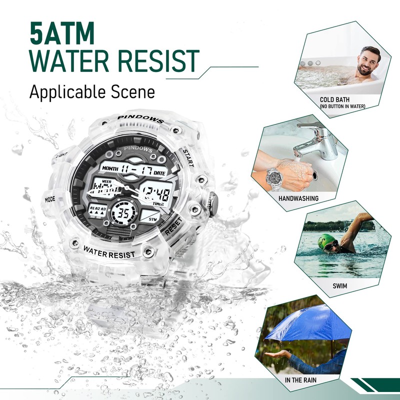 - Multifunctional sports watch: LED light, 3 alarms, countdown, stopwatch, 50 m waterproof, analogue digital display, double time, 12/24 hour system, manual sleep, calendar week display. This digital sports watch for men is fully functional and is perfect for indoor and outdoor sports and can be worn on any occasion.