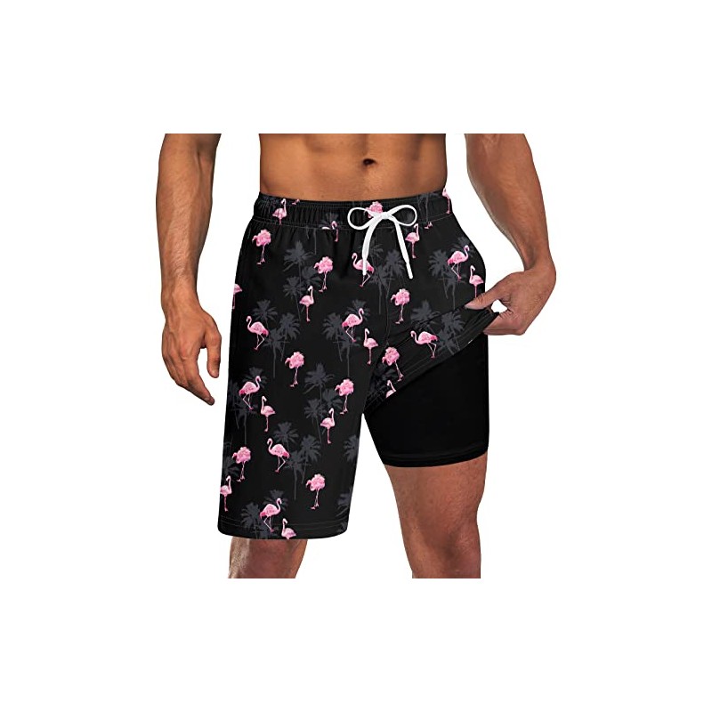 Men's Flamingo Swim Trunks with Compression Liner 9 Inch Inseam Board Shorts Bathing Suits Boxer Brief Quick Dry Swimsuit 2 in 1 Hawaiian Tropical Palm Tree Swimming Trunk