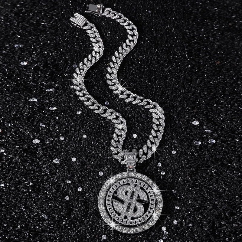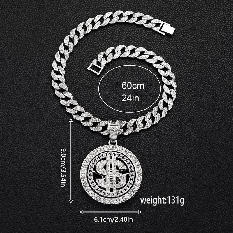 Men's necklace fashionable 360 degree rotating US dollar pendant with diamond inlaid coins rotating Cuban pendant accessory (silvery/24in)