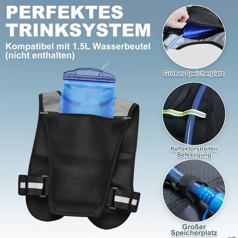 - Perfect drinking system: the hydration vest is equipped with a special water bag compartment that is compatible with 1.5 litre water bags; also has a 500 ml bottle and associated structures for easy hydration during training