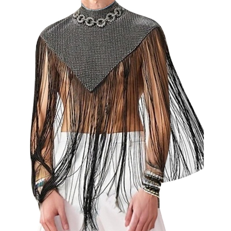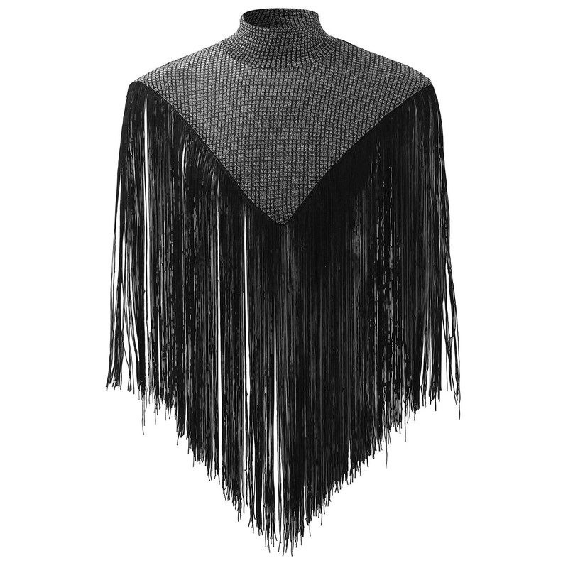 Men's Sequins Tassel Trim Turtleneck Sleeveless Fringed Solid Tee Top Shawl Wrap Cape Pullover Muscle Tank Top Disco 70s Rave Outfits