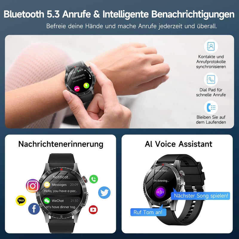 - Bluetooth 5.3 ALWAYS ON This men's watch with HD microphone and echo speaker will free your hands. It allows you to view notifications of incoming calls, text messages, WhatsApp, Facebook, Instagram, etc. in real time, and you also benefit from the built-in voice assistance to control your music, set reminders or check the weather via a simple voice command. Don't miss a call or message when driving or doing sports.