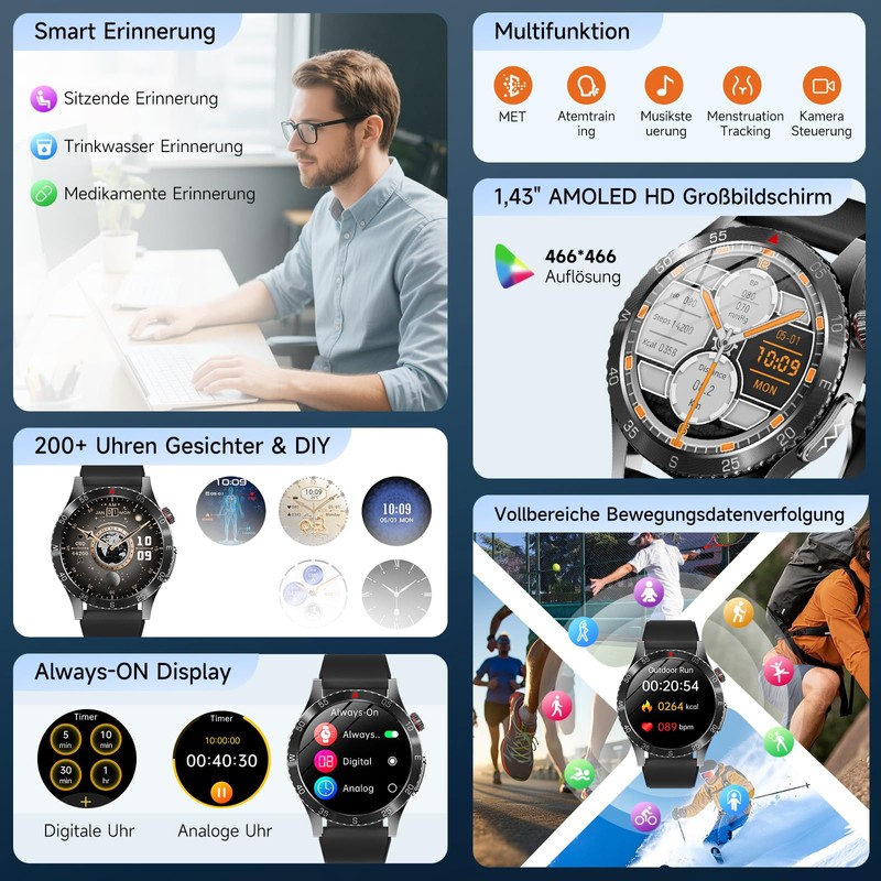 - Custom Smart Watch Features: The sports watch is compatible with Android and iOS phones (iOS 10.0 or higher, Android 5.0 or above). This robust man smart watch has many practical functions such as Bluetooth music, weather display, voice assistant, calculator, alarm clock and rule tracking to meet daily needs. This women's watch is equipped with a 1.43 inch HD touch screen and offers over 200 online dials to choose from in the app. You can also adjust the colour and style of the dial.