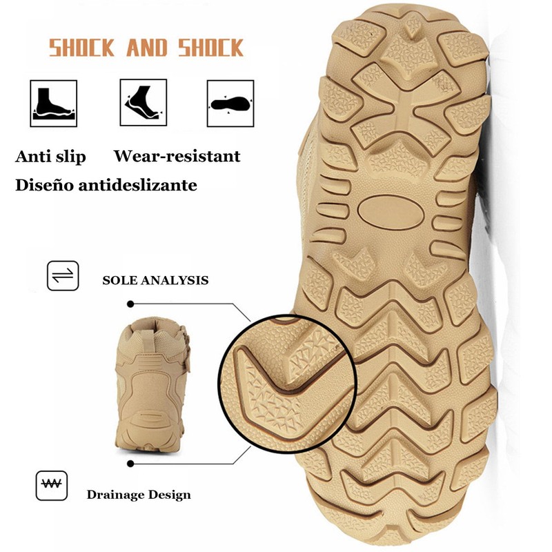 • Enhanced Comfort for Long Wear: Features a cushioned EVA midsole and breathable mesh lining to reduce foot fatigue. The padded collar and tongue offer ankle support, making them suitable for extended use in work, hiking, or tactical operations.