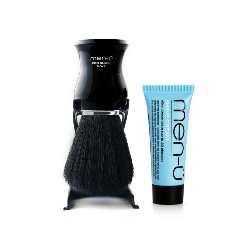 This shaving brush is designed with exclusive men-ü bristles that are smooth, solid, and non-absorbent, making it easier to create a lather without losing bristles. Unlike animal bristles such as badger, which are scaly, often with a hollow core and split ends, men-ü bristles do not require shave crème and water to penetrate them before the product is on their surface. Additionally, animal bristles expand and contract through absorption of shaving product and water, which can lead to bristle loss. The men-ü Pro Black Shaving Brush comes with a Shave Cream buddy tube 15ml.